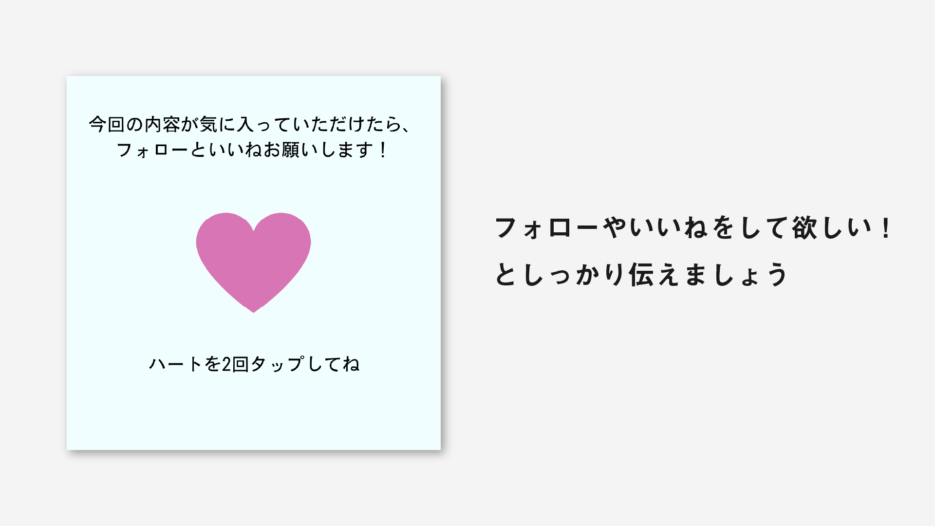 投稿の最後の1枚に「フォローをお願いします!」「いいねをお願いします!」と書いておくと良いですね。